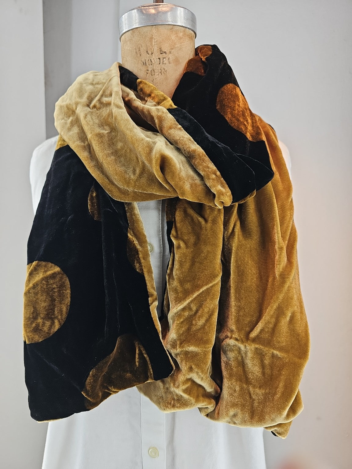 The Golden Eclipse scarf radiates warmth and bold sophistication. Its dramatic burnout velvet design features golden ochre circles on a deep black silk base, creating a striking contrast that evokes the glow of a solar eclipse. The reverse side — a rich honey-gold crushed velvet — brings softness, light, and a luxurious finish that glows in any light.