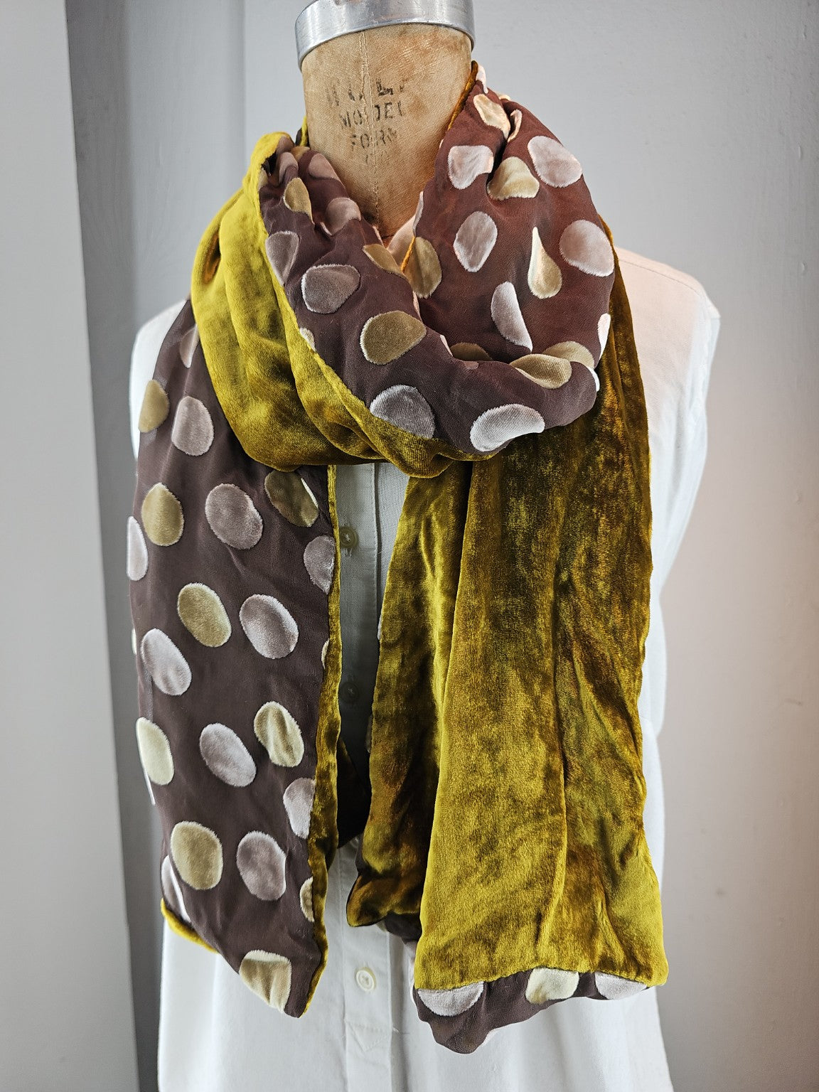 Front Pattern: Golden-olive velvet dots on chocolate-brown sheer silk