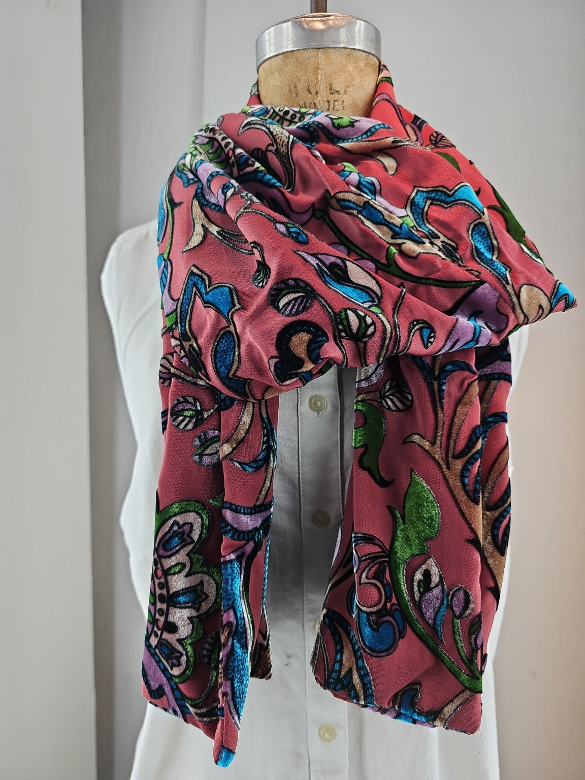 The Persian Rose scarf exudes bold artistry and warmth, featuring a vivid burnout velvet tapestry of swirling florals and vines. Shades of emerald, sapphire, and bronze emerge from a radiant rose-pink base, creating a sense of timeless luxury and movement. The rich silk blend gives this piece a luminous depth — both sensual and elegant.