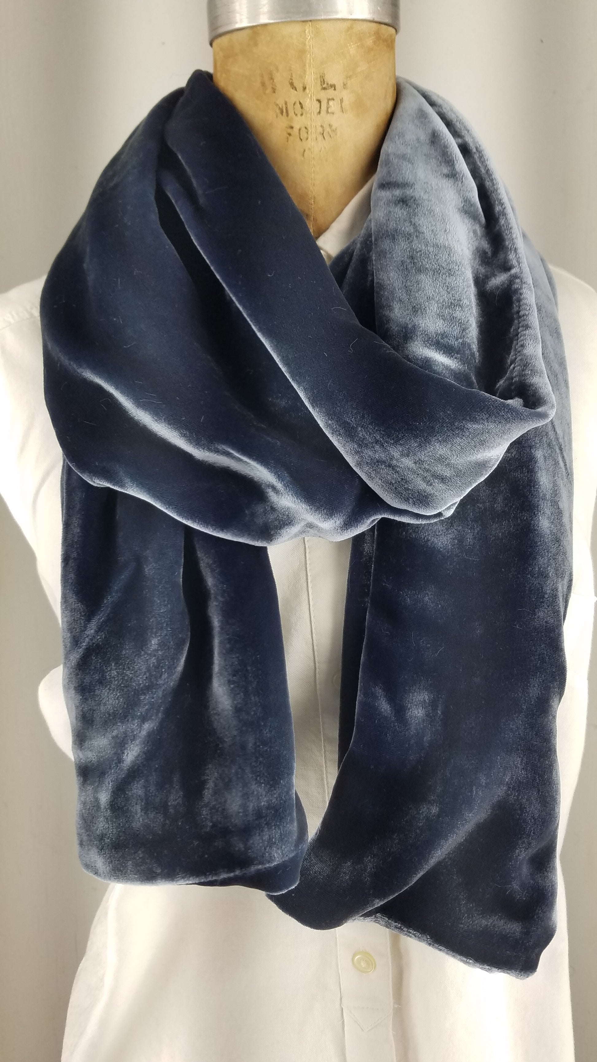 Handmade from smooth solid velvet, this scarf features a refined steel blue tone with a soft, elegant sheen. Its understated color brings quiet sophistication, while the plush velvet texture offers warmth and luxury. Perfect for versatile styling, from casual daywear to polished evening looks.