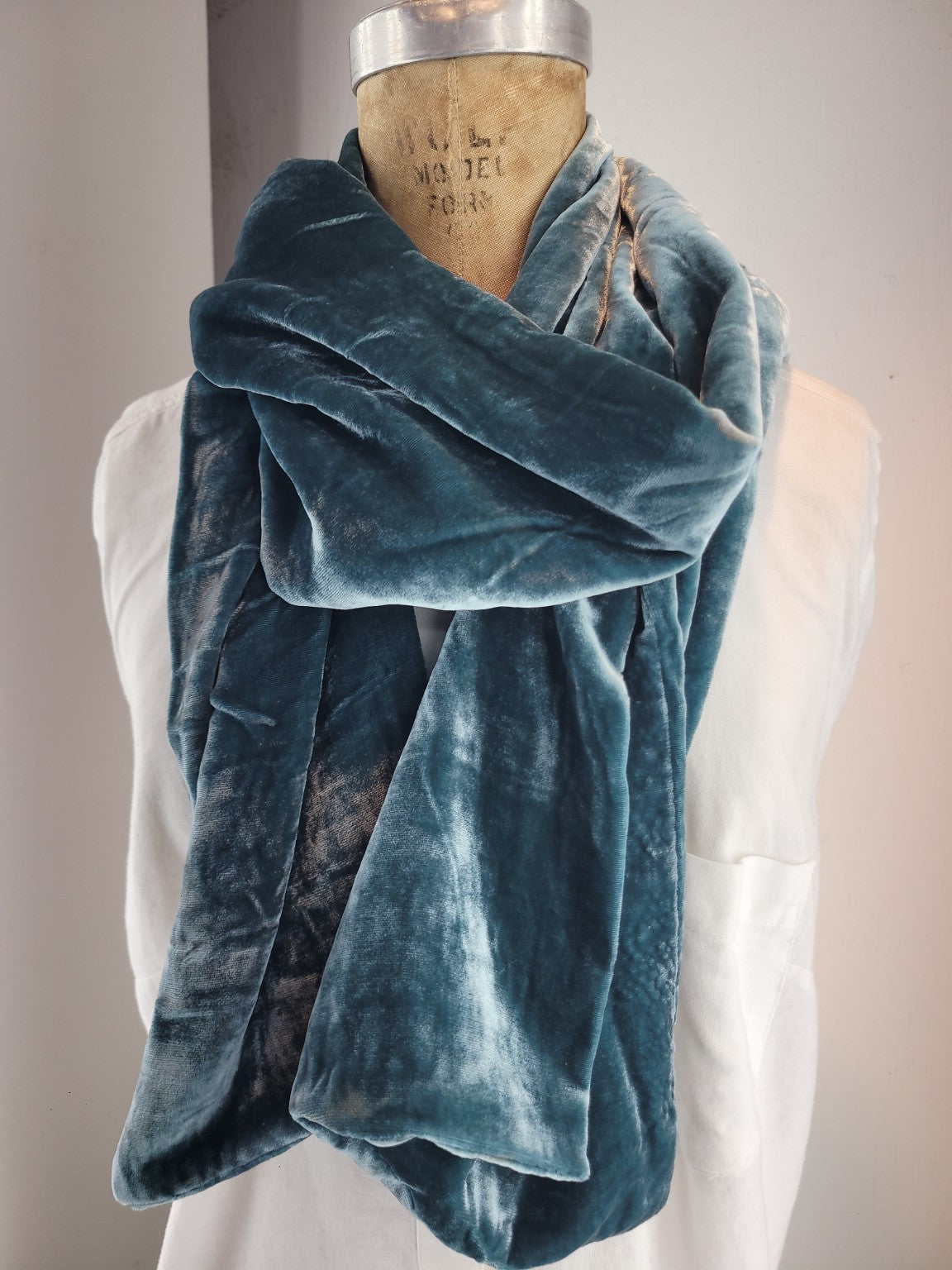 Handmade solid velvet scarf in a soft dusty teal tone. The muted shade brings a touch of sophistication, while the smooth silk velvet finish adds warmth and elegance. Measuring 72" long by 9" wide, it’s a versatile accessory that complements both classic and modern styles.