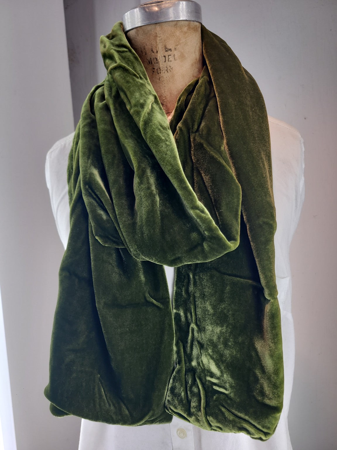 Handmade from smooth, lustrous solid velvet, this scarf features a rich olive green tone that captures natural elegance. The soft velvet texture and subtle sheen make it a versatile accessory — perfect for adding earthy sophistication to casual outfits or complementing evening wear with understated luxury.